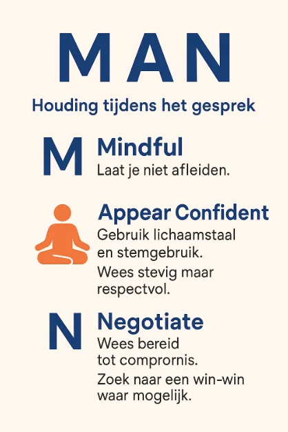 - M – Mindful (Mindful Blijven): Blijf gefocust op je doel. Laat je niet afleiden door zijsporen, oude koeien of pogingen om het onderwerp te veranderen. Houd je doel voor ogen. Soms helpt het om je verzoek te herhalen (de “kapotte plaat”-techniek).